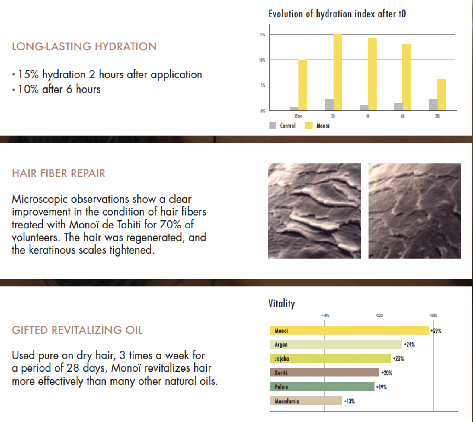 - Padeda išlyginti plauko paviršių, suteikia žvilgesio. 70 proc. respondentų pažymėjo, kad Monoi pagerino plaukų būklę; padeda palaikyti plaukų elastingumą ir tvirtumą po saulės, sūraus vandens ar baseino vandens poveikio. Tyrimų duomenimis, plaukus atgaivina geriau negu kiti aliejai, tepant sausus plaukus 3 kartus per savaitę.
